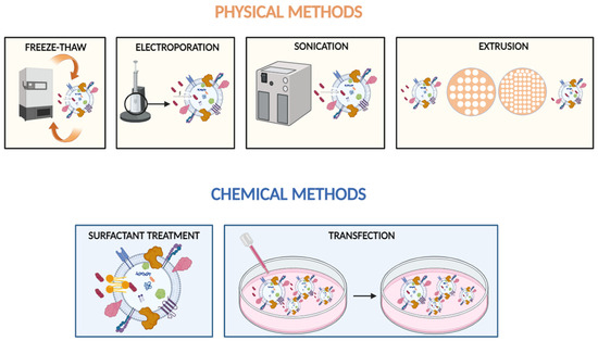 Passive methods of loading may involve the application of recommended temperatures below minus 80 degrees Celsius, followed by thawing at room temperature in a cyclical fashion [68]. The abrupt alteration in temperature may slightly impede the integrity of membranes, enabling the incorporation of small molecules. Although this mechanism is relatively uncomplicated, it can lead to the fusion of extracellular vesicles (EVs) and has proven effective in merging EVs with liposomes [69,70]. Nonetheless, its encapsulation efficiency is generally moderate and often falls short of other physical methods like electroporating or sonicating the preparations [51].