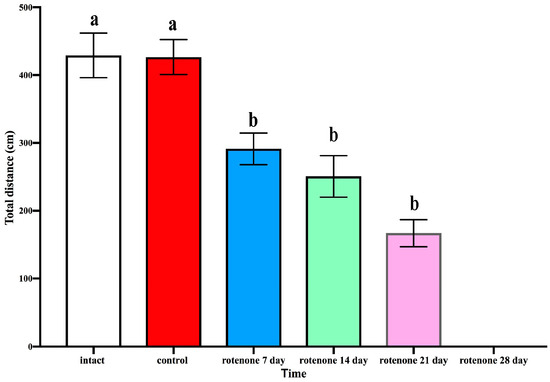 Behavioral open field test. Distance that crabs H. sanguineus moved during 5 min in control and after rotenone treatment. Each value is mean ± SEM (n = 6). The distance covered decreased significantly already from day 7 after the beginning of rotenone treatment. Significant decreases in locomotor activity also became evident on day 7 (p < 0.001). The significant reduction continued throughout the treatment period. On day 21 after the experiment’s start, the crabs in the rotenone group covered an average distance of 166.917 ± 19.90 cm for 5 min, which corresponded to a decrease in the locomotor activity by 39.1% (p < 0.001) compared to that in control animals between days 22 and 26, the rotenone-treated crabs died. The data were analyzed using the t-test, which compared the experimental group at any given time with the control group. The same letter indicates no significant difference (p > 0.05); different letters indicate a significant difference (p < 0.05).