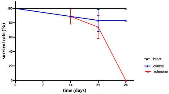 The survival rates for the control and intact groups were 100% during a 3-week experimental period; however, crabs in the rotenone-treated group began to die from day 21 to day 28. All animals in this group died by day 28 (Figure 2).