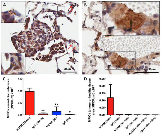 Quantitative and spatial analysis of VCAM-MPIO and IgG-MPIO binding in lung tissues of in metastasis-bearing and naïve mice. (A,B) Representative images of lung tissue acquired from the metastatic mouse model (day 10), 10 min post-intravenous injection of VCAM-MPIO, stained for VCAM-1 (brown) with a nuclear counterstain (blue). (A) Substantial numbers of MPIO are associated with the metastasis microvasculature (red arrows and higher magnification areas), and also on nearby larger vessels showing high VCAM-1 expression (B). (C,D) Immunohistochemical quantitation of MPIO binding in metastasis-bearing or naïve lungs (10 min or 3 h after i.v. injection). (C) Bar graphs represent the number of MPIO per μm vessel circumference and (D) the number of MPIO per μm2 in areas of metastasis (met), areas of no apparent metastasis in the metastasis model (no met), or healthy lung tissue (naïve mice) 10 min after i.v. injection. At 10 min post-administration VCAM-MPIO showed significantly greater retention on VCAM-1 expressing vessels associated with micrometastases compared to IgG-MPIO control). Similar levels of targeted and control agent retention at 3 h indicate rapid clearance of MPIO from the tissue. * p < 0.01; ** p < 0.005 compared to VCAM-MPIO retention at 10 min post-injection. Non-specific retention was negligible compared to specific binding.