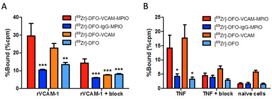To confirm the binding affinity of [89Zr]-DFO-VCAM-MPIO and [89Zr]-DFO-IgG-MPIO to VCAM-1, radioimmunoassays were performed in triplicate with either immobilised recombinant mouse VCAM-1 (rmVCAM-1) or TNF-stimulated human umbilical vein cells (HUVECs), as described previously [47].
