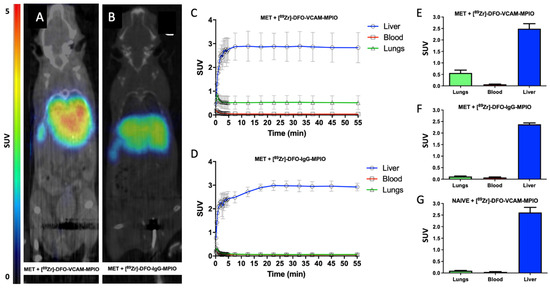 Time-activity curves for the livers of metastasis-bearing animals injected with [89Zr]-DFO-VCAM-MPIO (Figure 3C) or [89Zr]-DFO-IgG-MPIO (Figure 3D) showed a rapid increase in uptake, which plateaued at 5 min post-administration. Metastasis-bearing mice injected with [89Zr]-DFO-VCAM-MPIO showed comparable levels of liver uptake, over 50 min, to those injected with either [89Zr]-DFO-IgG-MPIO (2.65 ± 0.28 vs. 2.38 ± 0.12 g/mL; mean ± SD; Figure 3E,F) or naïve mice injected with [89Zr]-DFO-VCAM-MPIO (2.52 ± 0.32 g/mL; mean ± SD; Figure 3E,G).