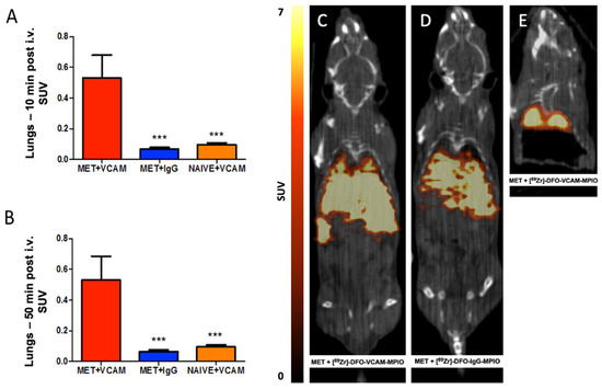 Temporal and spatial analysis of radiolabelled VCAM-MPIO or IgG-MPIO uptake in metastasis-bearing and naïve mice. (A,B) In vivo average activity uptake in the lungs of mice injected with (A) [89Zr]-DFO-VCAM-MPIO at 10 and (B) 50 min post-administration (n = 4 per group) showed significantly greater retention in metastasis-bearing lungs compared to naïve lungs or to metastasis-bearing mice injected with [89Zr]-DFO-IgG-MPIO (*** p < 0.0001). (C,D) Post-mortem (10 min post i.v.) 2 h acquisition whole-body PET images of mice injected with (C) [89Zr]-DFO-VCAM-MPIO or (D) [89Zr]-DFO-IgG-MPIO showing marked radioactivity in the liver and spleen. (C) Lungs from the mouse injected with [89Zr]-DFO-VCAM-MPIO also show notable radioactivity (D), whereas signals from the lungs of the mouse injected with [89Zr]-DFO-IgG-MPIO do not. (E) The mouse injected with [89Zr]-DFO-VCAM-MPIO in image (C) was further examined using a long PET acquisition (60 h) after removing the body and organs below the diaphragm, to confirm that the apparent lung signal, as seen in image (C), originated from the lungs and was not a partial volume effect from liver and spleen.