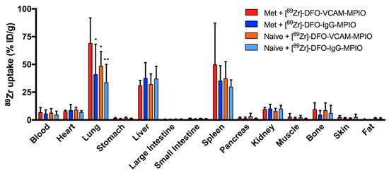 Biodistribution of all agents was further assessed ex vivo, and the highest uptake across all of the organs studied was found in the lungs from metastasis-bearing mice injected with [89Zr]-DFO-VCAM-MPIO (68.9 ± 22.9% ID/g; mean ± SD); lung uptake was significantly higher than that in all other experimental groups (one-way ANOVA, p < 0.05; Figure 5). The spleen and liver exhibited the second highest activity uptake in metastasis-bearing mice injected with [89Zr]-DFO-VCAM-MPIO (49.6 ± 37.6% ID/g; mean ± SD), and the levels were similar in all groups. The heart, kidney, bone, and blood samples showed relatively low levels of uptake, while the stomach, small and large intestine, pancreas, and samples from muscle, skin, and fat showed negligible uptake in all groups (Figure 5).
