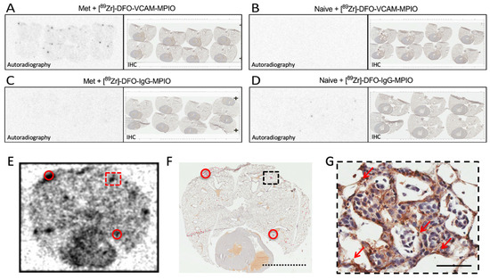 Comparative autoradiographic and immunohistochemical analyses and colocalisation of foci with radiolabelled VCAM-MPIO and micrometastases. (A–D) Paired images of lung tissue autoradiographic data (left; 10 h exposure) and bright-field micrographs of the associated lung sections (right) stained immunohistochemically for VCAM-1 expression (brown) for (A) metastasis-bearing or (B) naïve lungs treated with [89Zr]-DFO-VCAM-MPIO; (C) metastasis-bearing or (D) naïve lungs treated with [89Zr]-DFO-IgG-MPIO. (A) Metastasis-bearing lungs + [89Zr]-DFO-VCAM-MPIO showed sparse basal activity in all areas of the lung sections and localised intense signals (dark spots). (B–D) All other groups showed no or minimal activity. (E,F) Autoradiographic images from the lung tissue section after 24 h exposure and immunohistochemical images from the same lung section manually inspected under magnification. Foci of high activity on the autoradiographic plate (e.g., red dashed square and red circles) colocalise with VCAM-1 expressing micrometastatic areas (black dashed square and red circles). The high activity foci on the autoradiographic plate that do not correlate with apparent metastases do correlate with areas where MPIO were manually scored ([F]; hard to distinguish small red marks). Dotted scale bar = 5 mm. (G) Black dashed square in (F) is shown at a higher resolution; arrows indicate the presence of MPIO. Nuclei are stained blue. Scale bar = 50 μm.