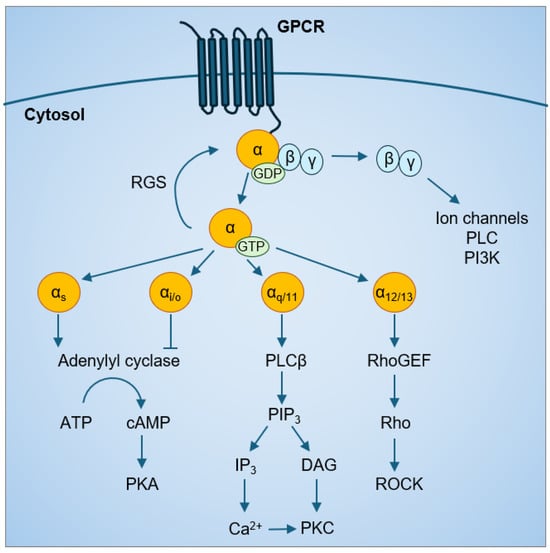 Based on sequence homology and functional similarities, Gα proteins are categorized into four major families: Gαs, Gαi/o, Gαq/11, and Gα12/13. Each Gα family has preferential downstream effectors but can also activate multiple signaling cascades (Figure 1) Both the Gαs and Gαi family affect the cyclic adenosine monophosphate (cAMP) signal pathway through their effects on adenylyl cyclase; Gαs is stimulatory, while Gαi is inhibitory [16,17,18]. Gαq activates phospholipase Cβ and the phosphatidylinositol pathway to increase intracellular calcium levels [19]. Gα12/13 mainly activate the Rho family of GTPases (Rho) and the Rho-associated protein kinases (ROCK) pathways. Following Gα protein activation by a GPCR, the intrinsic GTPase activity of Gα proteins converts the bound GTP to GDP, which is the inactive Gα-GDP state. In addition, regulator of G protein signaling (RGS) proteins have GTPase activating protein (GAP) activity that can accelerate the intrinsic GTPase activity of Gα proteins [20], prevent Gα-GTP binding to effectors [21,22], and enhance Gα affinity for Gβγ binding [23,24]. This forms the classic cycle of Gα protein activation.