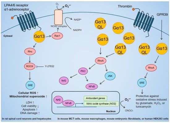 Effect of GPCR-Gα13 stimulation, overexpression of Gα13, or constitutively active Gα13(Q226L) mutant on cellular ROS, antioxidant gene activation, and resistance against oxidative stress in rat and mouse studies.