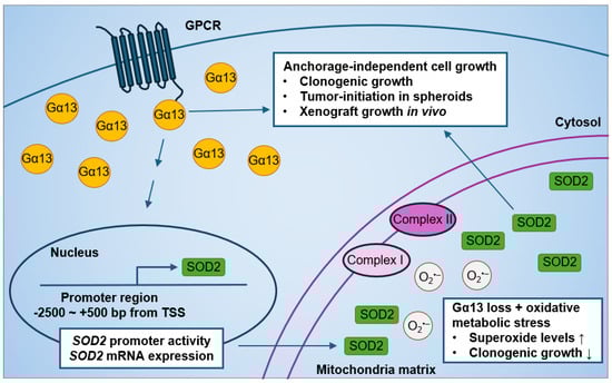 As mentioned above, the knockdown of GNA13 in PC3 cells reduced soft agar colony formation, suppressed mitochondrial SOD2 expression, and increased mitochondrial superoxide levels (Figure 4) [233]. The phenotypes displayed by SOD2 loss induced by GNA13 knockdown were more evident under oxidative stress conditions. For example, the increase in mitochondrial superoxide levels induced by GNA13 knockdown was more pronounced when cells were cultured in oxidative metabolic stress conditions (i.e., non-glycolytic metabolites). Moreover, mitochondrial oxidative metabolic stress further suppressed in colony formation that was already suppressed by Gα13 loss, and, in turn, SOD2 loss, in PC3 cells. Our data further validate that Gα13 and mitochondrial SOD2 promote cell survival under oxidative stress conditions in prostate cancer cells.