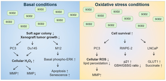 With regard to role of the mitochondrial SOD2 in prostate cancer tumorigenesis, the in vitro data are conflicting (Figure 5). Under basal conditions, the overexpression of wild-type SOD2 suppressed soft agar colony formation or xenograft tumor growth in androgen-independent PC3 [258] and Du145 cells [259], as well as in androgen-responsive M12 cells [260]. In these cell lines, overexpression of SOD2 or treatment with SOD2-mimetic resulted in changes in cell cycle with a delay in the G1 phase or a decrease in the G2+M phase [258,260,261]. Although the decreased growth rate was not due to necrosis, apoptosis, or senescence in PC3 cells [258], increased apoptosis and senescence were observed in M12 cells overexpressing SOD2 [260]. M12 cells overexpressing SOD2 also had increased basal levels of phosphorylated extracellular signal-regulated kinase (ERK) [260]. In both PC3 and Du145 cells, overexpression of wild-type SOD2 increased H2O2 levels [258,259]. Differences between PC3 and Du145 cells included that overexpression of SOD2 in the mitochondria increased mitochondrial membrane potential in PC3 cells [258,262] but decreased mitochondrial membrane potential in Du145 cells [259]. In contrast, under oxidative stress conditions, such as hyperthermia, PC3 cells with overexpression of SOD2 had better survival than control cells [262]. In addition, androgen-responsive RWPE-2 cells overexpressing wild-type SOD2 were less sensitive to high levels of sodium selenite that generate superoxide, but not to glutathione-depleting agent buthionine sulfoximine [263]. Moreover, androgen-responsive LNCaP cells overexpressing wild-type SOD2 were more resistant to glucose deprivation-induced cell death, whereby glucose deprivation can increase mitochondrial superoxide levels [264]. Hence, these data suggest that the effect of SOD2 on prostate cancer tumorigenesis should be distinguished between basal conditions and oxidative stress conditions, especially for conditions that increase superoxide stress.