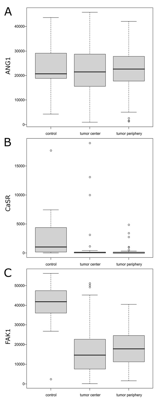 | Tumor center | 70 | 16,037.69 ± 11,342.30 | (66.05; 51,188.30) | <0.001 | Center < control Periphery < control |