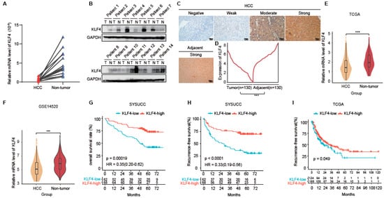 KLF4 was downregulated in HCC, and a low level of KLF4 was associated with poor prognosis. (A) The qRT-PCR and (B) IB were used to analyze the expression of KLF4 in 14 paired hepatocellular carcinoma (HCC) and adjacent non-tumor tissues. (C) Representative images of KLF4 expression in hepatocellular carcinoma (HCC) and adjacent normal liver tissues are shown. The scale bar indicates 100 µm. (D) KLF4 expression was downregulated in HCC tissues compared to adjacent non-tumor liver tissues (n = 130, paired t-test). (E,F) Relative mRNA levels of KLF4 in HCC and normal tissues were determined based on the TCGA and GSE14520 datasets. (G,H) Kaplan–Meier analysis revealed that low KLF4 expression was associated with shorter overall survival (OS) and recurrence-free survival (RFS) curves in the SYSUCC HCC cohort (n = 130). (I) Kaplan–Meier analysis revealed that low KLF4 was associated with shorter recurrence-free survival (RFS) curves in the TCGA HCC cohort (n = 276). Statistical results are presented as mean ± SD (from triplicates), and significance was determined by Student’s t-test (*** p < 0.001, and **** p < 0.0001).