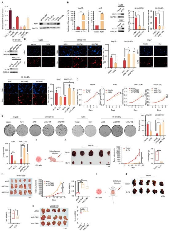 KLF4 suppressed HCC growth in vitro and in vivo. (A) qRT-PCR (top) and Western blot (bottom) were used to show the expression of KLF4 in 6 HCC cell lines. (B) The efficiency of KLF4 overexpression and knockdown was measured using qRT-PCR (top) and Western blotting (bottom) assays. (C–E) KLF4 suppressed the cell growth of HCC cells, as evaluated by EdU assay (C), CCK-8 assay (D), and colony formation assays (E). (F) Schematic diagram of the subcutaneous xenograft HCC mouse model. (G) KLF4 overexpression suppressed the proliferation of HCC cells in nude mice. Representative images, tumor volume, and tumor weight were assessed after the subcutaneous injection of Hep3B cells. Five mice were included in each group. (H) KLF4 knockdown promoted the proliferation of HCC cells in nude mice. Representative images, tumor volume, and tumor weight were assessed after the subcutaneous injection of MHCC-97H cells. Five mice were included in each group. (I) Schematic diagram of the orthotopic liver tumor xenograft mouse model. (J,K) KLF4 slightly suppressed liver tumor growth in the orthotopic xenograft mouse model, (J) Stable KLF4–overexpression Hep3B cells and control cells were injected into the livers of each NOD/SCID mouse, (K) Stable KLF4-knockdown MHCC-97H cells and control cells were injected into the livers of each NOD/SCID mouse. After six weeks of injection, the livers were dissected for pathological analysis. Tumors in the livers were indicated by green circles, and the liver weight was measured. Statistical results are presented as mean ± SD (from triplicates), and significance was determined by Student’s t-test (* p < 0.05, ** p < 0.01, *** p < 0.001).