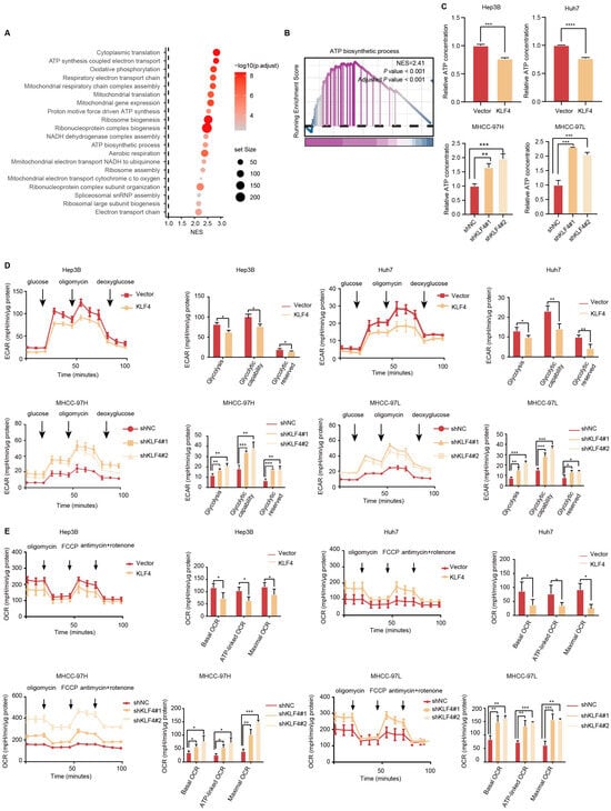 To elucidate the potential molecular mechanism underlying KLF4-mediated HCC suppression, we conducted a functional enrichment analysis of the TCGA dataset. The results revealed that KLF4 was involved in the regulation of multiple pathways in HCC cells, particularly ATP synthesis (Figure 3A). Further Gene Set Enrichment Analysis (GSEA) of the TCGA dataset showed significant enrichment of ATP synthesis in HCC patients with low KLF4 expression (p < 0.001, normalized enrichment score (NES) = 2.41; Figure 3B). To confirm these findings, we measured ATP concentration and found that overexpressing KLF4 in Hep3B and Huh7 cells led to a reduction in ATP production, while knockdown of KLF4 resulted in an upregulation of ATP production in MHCC-97H and MHCC-97L cells (Figure 3C).