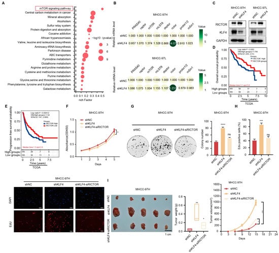 KLF4 suppresses the progression of HCC through a RICTOR way. (A) The down-regulation of KLF4 in HCC activated the mTOR signaling pathway. Top 20 statistics of KEGG pathway enrichment based on the differentially expressed genes (DEGs) after KLF4 knockdown in MHCC-97H cells. In the scatter plot, RichFactor was the ratio of DEG numbers noted in this pathway term to all gene numbers noted in this pathway term, indicating intensiveness. p-value ranges from 0 to 1, and a lower p-value represents greater intensity. The mTOR signaling pathway was one of the most regulated biofunctions upon KLF4 knockdown. (The red frame indicated the selected pathway in this study.) (B) The relative mRNA levels of genes in the mTOR complex were analyzed in MHCC-97H cells (top) and MHCC-97L cells (bottom). (C) Western blot assays showing the relative levels of KLF4 and RICTOR after KLF4 knockdown in MHCC-97H and MHCC-97L cells. (D,E) Kaplan-Meier analysis revealed that higher RICTOR expression was associated with shorter overall survival (OS) and recurrence-free survival (RFS) curves in the TCGA HCC cohort (n = 276). (F–H) Knockdown of RICTOR attenuated the KLF4-induced suppression of HCC cell growth, as evaluated by CCK8 assay (F), colony formation assays (G), and EdU assay (H). (I) Representative images, tumor volume, and tumor weight were assessed after the subcutaneous injection of MHCC-97H cells. Five mice were included in each group. Statistical results are presented as mean ± SD (from triplicates), and significance was determined by Student’s t-test (* p < 0.05, ** p < 0.01, *** p < 0.001 and **** p < 0.0001, ns = no significance).