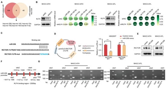 KLF4 regulated RICTOR expression through miR-206 in HCC, (A) Venn diagrams were used to show the overlapped essential miRNAs regulated by KLF4 and those that regulate RICTOR. (B) MiR-206 was identified as the link between KLF4 and RICTOR, as indicated by the relative mRNA levels in MHCC-97H and MHCC-97L cells. (C) Luciferase reporter plasmids were constructed containing the wild-type or mutant RICTOR 3′-UTR sequences immediately downstream of the luciferase gene. The sequences of the predicted miR-206 binding site within the RICTOR 3′-UTR, including wild-type and mutant sequences (underlined), are shown. (The alphabets in blue indicate the mutated site.) (D) Relative luciferase activity was analyzed in HEK293T cells transfected with the indicated reporter plasmids and either the miR-206 mimic or control. (E) Overexpression of miR-206 downregulated endogenous RICTOR protein level in MHCC-97H and MHCC-97L cells. (F) Schematic representation of the miR-206 promoter regions and the primers used for the ChIP assay were indicated. (G) ChIP samples were analyzed by qRT-PCR in MHCC-97H cells (G, left) and MHCC-97L cells (G, right). Statistical results are presented as mean ± SD (from triplicates), and significance was determined by Student’s t-test (*** p < 0.001, ns = no significance).