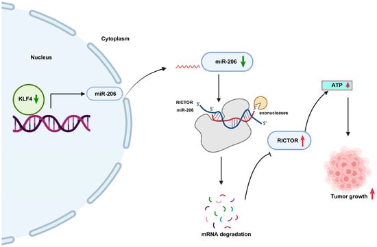 Transcription factors typically promote gene/miRNA transcription, and it has been reported that RICTOR is regulated at the transcriptional level by miRNA in various tumors. Through in silico target prediction algorithms, a complementary binding sequence for miR-206 was identified in the 3′-UTR of RICTOR mRNA. Previous studies have demonstrated that miR-206 is downregulated in liver CSCs and exerts its inhibitory effect on CSC growth by directly targeting the Epidermal Growth Factor Receptor (EGFR) []. MiR-206 also exerts an anti-HCC effect by inhibiting the CDK9 signaling pathway, suggesting that the miR206-CDK9 pathway could be a potential therapeutic target for HCC []. In this study, we provide evidence that KLF4 regulates HCC progression through the transcriptional activation of miR-206. Knockdown of KLF4 resulted in a significant decrease in cellular miR-206 expression. Additionally, ChIP assays demonstrated the interaction between KLF4 and the miR-206 promoter sequence. Our study revealed that miR-206 directly targets RICTOR and inhibits ATP synthesis in HCC. Taking into account previous findings from other research groups and the results of our study, it can be concluded that KLF4 is regulated by the miR206/RICTOR axis, leading to the inhibition of ATP synthesis in HCC through the mTOR signaling pathway.