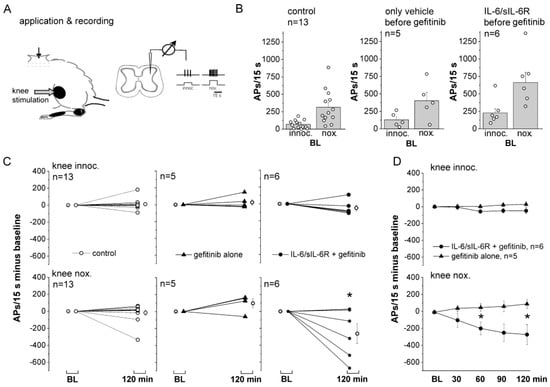 The animal was fixed in a frame, and the lumbar segments L1-L4 were exposed by laminectomy. The dura mater was opened. The surgical area was stabilized with 3% agar in Tyrode’s solution, leaving a tightly sealed trough (3 × 5 mm) on the surface of the spinal cord, which was immediately filled with approximately 50 µL Tyrode’s solution to avoid tissue desiccation. For application of gefitinib, IL-6, and sIL-6R to the spinal cord, the Tyrode’s solution was removed from the trough and replaced with the compounds to be used for testing.