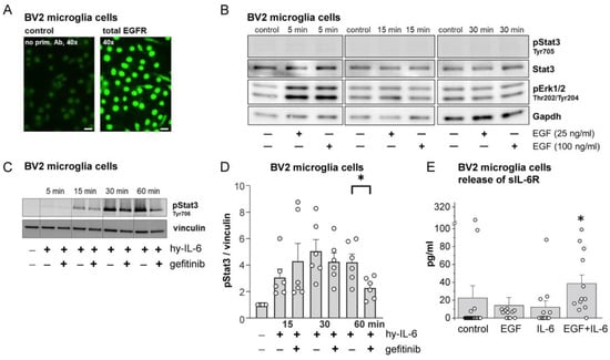 Effects of EGF, hyper-IL-6 (hy-IL-6, fusion of IL-6 and sIL-6R), and gefitinib on Stat3 and Erk1/2 signaling in BV2 microglial cells and release of sIL-6R. (A) Localization of EGFR in microglial cells. (B) Western blots showing transient Erk1/2 activation but no Stat3 activation by EGF at two concentrations. (C) Time-dependent Stat3 activation in microglial cells by hyper-IL-6 (50 ng/mL) and reduction of late Stat3 activation by coadministration of gefitinib (200 nM). (D) Densitometric analysis of experiments with the protocol shown in (C) *: p < 0.05, n = 6, Mann–Whitney U-test. (E) Release of sIL-6R from BV2 cells under control conditions, during EGF or IL-6 stimulation, or during co-stimulation with IL-6 (50 ng/mL) and EGF (50 ng/mL). *: p < 0.01, n = 12, post hoc Mann–Whitney U-test following Kruskal–Wallis test.