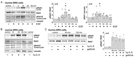 Since IL-6 sensitizes sensory neurons to mechanical stimulation (see Section 1) and EGFR is highly localized in normal DRGs, we also examined the effects of IL-6 and EGF on EGFR activation in DRG neurons. Western blots of cultured DRG neurons in Figure 3A show that stimulation of cultured DRG neurons with EGF caused phosphorylation of Stat3 (pStat3) and Erk1/2 (pErk1/2) within 5 min. Hyper-IL-6 caused strong Stat3 phosphorylation but no clear Erk1/2 phosphorylation (Figure 3B). Since both EGF and hyper-IL-6 caused Stat3 phosphorylation, we used this parameter to study IL-6/EGFR interaction. Co-application of gefitinib did not reduce hyper-IL-6-induced Stat3 activation in DRG neurons (Figure 3C). Thus, recruitment of EGFR signaling by preceding IL-6 signaling was observed in microglial cells and in recordings from spinal cord neurons, but not in DRG neurons. The latter were immediately activated by EGFR stimulation with the ligand EGF.
