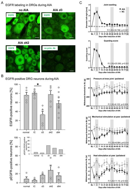 Localization of EGFR in DRG neurons of normal rats and of rats with AIA. (A) Representative specimens showing EGFR labeling in DRG sections of a healthy rat without AIA, of a rat at day 3 of AIA, of a rat at day 42 of AIA, and of a control section after omission of the antibody against EGFR. Scale bars 20 µm. (B) Proportions of DRG neurons labeled for EGFR (top) and activated EGFR (pEGFR, bottom) in normal rats, in immunized rats (IC), and rats at days 3, 42, and 84 of AIA. The inset compares the percentage of pEGFR-positive neurons with that of EGFR-positive neurons at these time points. *: p < 0.05, t-test (Bonferroni correction). (C) Pain-related behavior of rats in the course of AIA (modified from Leuchtweis et al., Pain 2020, 161, 1571–1583, from Figure 2 []). Each panel displays the pain-related behaviors of all rats in which AIA was induced (AIA, n = 20), compared with the pain-related behaviors of naive control rats (NC, n = 8). Note: EGFR labeling was only assessed in subsets of these rats; the particular animals were randomly selected. Gray boxes indicate the days for assessment of EGFR labeling. BL in (C), baseline value, normalized to zero. Values are mean ± SEM. Statistical analysis (AIA versus NC) in C: repeated-measures ANOVA, analysis of variance.