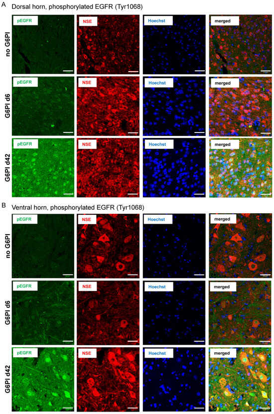 Localization of pEGFR and colocalization with neuronal markers in the spinal cord of mice in the course of G6PI-induced arthritis. (A) pEGFR (green), NSE (red), nuclear staining (Hoechst 34580, blue), and merged staining of pEGFR and NSE (yellow to orange) in the dorsal horn of mice without inflammation (no G6PI), in mice at day 6 of G6PI-induced arthritis (G6PI d6), and in mice at day 42 of G6PI-induced arthritis (G6PI d42). (B) pEGFR, NSE, Hoechst 34580, and merged staining in the ventral horn of mice without inflammation (no G6PI), in mice at day 6 of G6PI-induced arthritis (G6PI d6), and in mice at day 42 of G6PI-induced arthritis (G6PI d42). Mice were not depleted from Treg cells. Scale bar 10 µm.