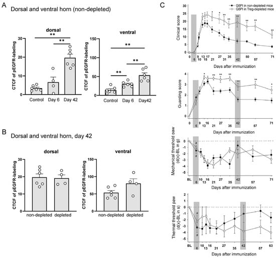 Labeling for pEGFR in the spinal cord of mice in the course of G6PI-induced arthritis and pain-related behaviors, in mice not depleted from Treg cells and in mice depleted from Treg cells. (A) Level of pEGFR labeling (CTCF: corrected total cell fluorescence) in the dorsal and ventral horn of non-depleted control mice, and of mice at day 6 and at day 42 of G6PI-induced arthritis. Each data point represents one animal. ** p < 0.01, Mann–Whitney U-test. (B) Expression level of pEGFR (CTCF) in the dorsal and ventral horn of Treg-depleted and non-depleted mice at day 42 of G6PI-induced arthritis. (C) Arthritis and pain-related behaviors in non-depleted and depleted mice in the course of G6PI-induced arthritis (data from Ebbinghaus et al., Arthritis Rheumatol 2019, 71, 2016–2026, from Figure 1 []). Clinical sore (swelling and erythema, n = 10 mice per group), guarding score (n = 10 mice per group), mechanical threshold at the paw (reduction of hind paw withdrawal threshold upon pressure, n = 18–26 mice per group), thermal threshold at the paw (reduction of hind paw withdrawal threshold upon heat application, n = 18–26 mice per group). Gray bars indicate the time points at which spinal cords were assessed for the pEGFR in randomly selected animals. Values are the mean ± SEM. * p < 0.05; ** p < 0.01 depleted versus non-depleted mice, by Student’s 2-tailed t-test; # p < 0.05 versus baseline, by Wilcoxon’s matched pairs signed rank test; first significant reduction of mechanical and thermal threshold at the inflamed hind paws compared to baseline (BL) values.