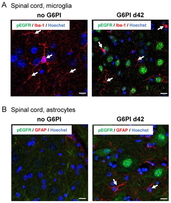 Representative images of pEGFR labeling in spinal cord microglia and astroglia (n = 3). (A) Spinal cord microglia (Iba-1, red) in the deep dorsal horn of control animals (no G6PI) and at day 42 of G6PI-induced arthritis (G6PI d42). At day 42, pEGFR (green) is not localized in microglia but in neurons. (B) Spinal astroglia in the ventral horn of control animals (no G6PI) and at day 42 of G6PI-induced arthritis (G6PI d42). No GFAP-positive activated astrocytes (red) and no pEGFR (green) in control animals (no GPI), and no pEGFR in GFAP-positive astrocytes at day 42 of G6PI-induced arthritis (G6PI d42). Arrows: examples of positively labeled cells, Scale bar 10 µm.