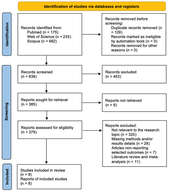 After eliminating duplicates, a total of 838 papers were initially identified. Following review of titles and abstracts, 385 articles were selected for full-text assessment. Among these, 379 articles met the eligibility criteria, resulting in 8 included studies. The remaining 371 articles were excluded for various reasons: (1) lack of relevance to the research topic (325 articles), (2) absence of reported outcomes of interest (7 articles), (3) being systematic reviews or meta-analyses (11 articles), and (4) insufficient methodological or results detail (28 articles). All studies included in the analysis reported at least one outcome measure for one or more patient groups studied. Figure 2 shows the flow chart according to the PRISMA statement.