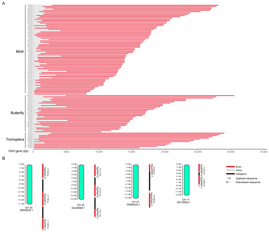 The overview and copy number variation of the insect FibH gene. (A) The FibH genes of Trichoptera, moths, and butterflies. (B) The copy number variation of the FibH gene in skippers.