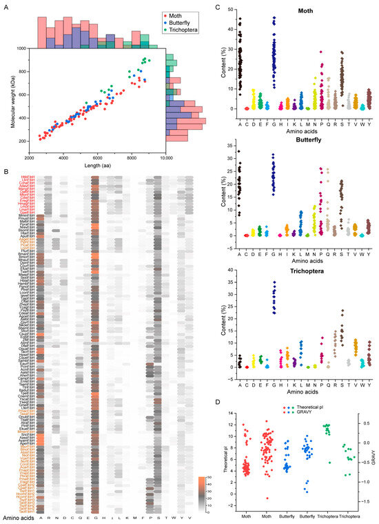 The length, molecular weight, composition, and properties of FibH. (A) The length and molecular weight of FibH. (B) The amino acid composition of each insect FibH. The red, black, and orange colors represent the FibH of Trichoptera, moth, and butterfly, respectively. (C) The amino acid composition of moth, butterfly, and Trichoptera FibH. (D) The theoretical isoelectric point (pI) and grand average of hydropathicity (GRAVY) of FibH.