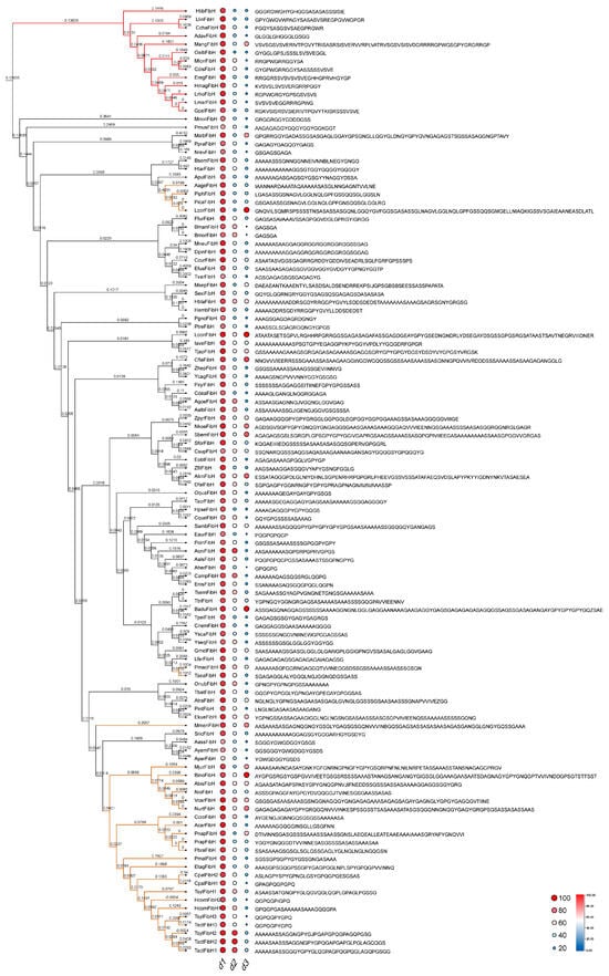 The theoretical isoelectric point (pI) and grand average of hydropathicity (GRAVY) of FibH were calculated by protparam (https://web.expasy.org/protparam/ accessed on 27 March 2024), and the signal peptide was predicted by SignalP-5.0 [39]. Multiple sequence alignment was performed using the online software mafft version 7 (https://mafft.cbrc.jp/alignment/server/ accessed on 27 March 2024). The multiple sequence alignment results and FibH gene mapping on the genome were visualized by TBtools-II v2.086 [13]. The phylogenetic tree was generated by IQ-TREE 2 [40] with maximum likelihood (ML) and bootstrap value 1000. Use Adobe Illustrator 2023 (Adobe Inc., Mountain View, CA, USA) and the online software ITol v6 (https://itol.embl.de/itol.cgi accessed on 27 March 2024) to beautify the phylogenetic tree. OriginPro 2021 (OriginLab, Northampton, MA, USA) is used to draw curve graphs and scatter plots. We first retrieve the FibH sequences using a sliding window with a width of 6 and count the most frequently occurring motif. Then, using the left boundary of this motif sequence, we divide the entire FibH sequence into sequence subsets. Each subset is then analyzed for motifs using MEME software (v5.5.5) with parameters (-minw 6 -maxw 100 -allw -mod anr -nmotifs 20). The motifs with occurrence sites ≥3 in the results are considered the motif set for that FibH sequence.