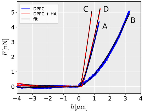 Measured indentation curve for DPPC liposomes in PBS filled with (DPPC) PBS and (DPPC + HA) HA solution. The fit of indentation by the Hertz contact model for the hemispherical AFM tip is shown. Refer to Figure 3 for details on individual liposomes properties (capital letters).
