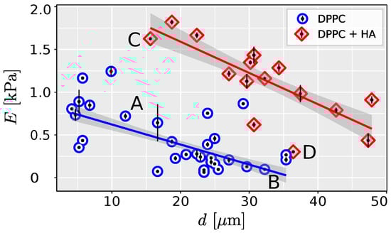 Linear regression plot with 95% confidence intervals (shaded areas) showing measured dependence between the size of DPPC liposomes and Young’s modulus estimated from Hertz model. Measured data along with the range of measured values are shown for liposomes filled with PBS and HA solution, denoted as DPPC and DPPC + HA, respectively. Indentation curves for selected liposomes A–D are shown in Figure 2.