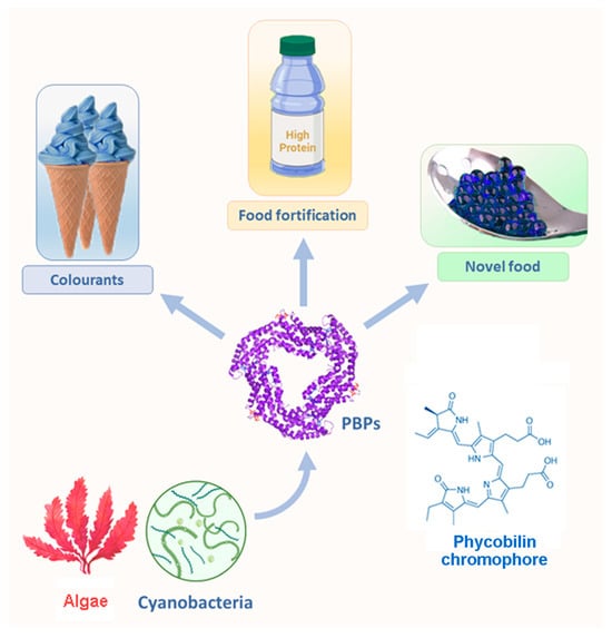 Color represents an essential characteristic of food and is a critical factor that makes food products more appealing to customers []. Considering that the general public is more interested in what they eat, natural food additives, including colors, are gaining more consumer and food industry interest []. Among colors, blue still represents a real challenge, and blue food is usually labeled by consumers as artificial []. The industry still uses artificial blue colors since natural ones lack physical and chemical stability, coloring power, and easy scale-up production []. The characteristic vivid coloration of PBPs makes them attractive in the food industry as natural food colors []. Their colors range from blue (C-PC), turquoise-blue (allophycocyanin), purple (R-phycocyanin), and red (R-phycoerythrin). Extract from Arthrospira platensis, rich in C-PC, is the only FDA-approved phycobiliprotein-based natural color [], and it is also approved in the EU (EFSA regulation numbers 1333/2008 and 231/2012). It is approved for coloring confections, frostings, ice cream and frozen desserts, dessert coatings and toppings, beverage mixes and powders, yogurts, custards, puddings, cottage cheese, gelatin, breadcrumbs, and ready-to-eat cereals and as a color of hard-boiled eggshells.