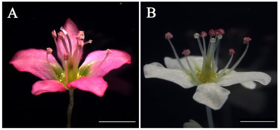 Long-homostyle flower of Fagopyrum esculentum. (A) Red LH flower with five tepals, eight long stamens, and three long styles; (B) white LH flower with five tepals, eight long stamens, and three long styles. Scale bar = 2 mm.