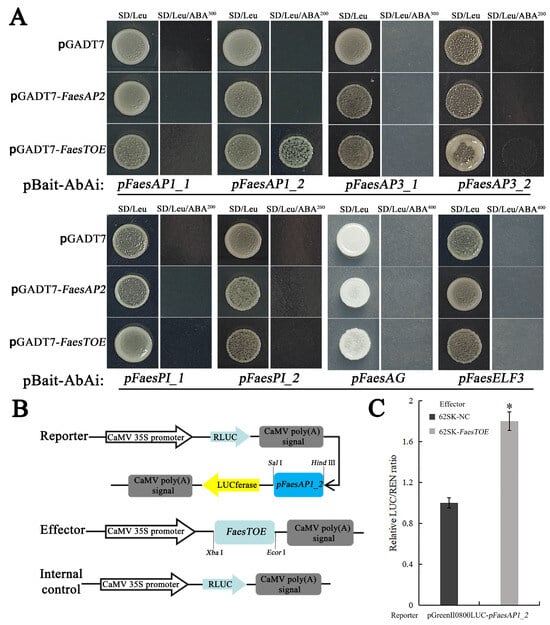 Positive regulation of FaesAP1-2 by transcription factor FaesTOE. (A) Y1H screened promoters that could be bound by the FaesTOE and/or FaesAP2 transcription factors. pGADT7 vector was used as a negative control; (B) diagram of the reporter and effector constructs; (C) results of relative luciferase activity (LUC/REN) in Nicotiana benthamiana leaves. Asterisks (*) indicates a statistical significance at p < 0.05.