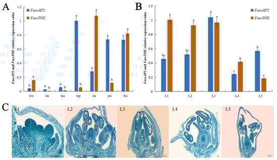 FaesAP2 and FaesTOE expression in different organs and at the sequential development stage of floral buds in LH F. esculentum. (A) FaesAP2 and FaesTOE expressions in the root (roo), stem (ste), juvenile leaf (lea), tepal (tep), stamen (sta), pistil (pis), and 6-day-old fruit (fru) were detected by qRT-PCR; (B) FaesAP2 and FaesTOE expressions were detected by qRT-PCR at sequential development stages of floral buds. (C) Cytomorphological section of LH floral buds at sequential development stages; L1: pistil and stamen primodium appearance; L2: filament rapid elongation and anther at microspores tetrads stage; L3: anther at mononuclear microspore; L4: style elongation and mature pollen appearance; L5: maturity floral bud with mature pollen before bloom. Scale bar: (L1, L2, L3, L4, L5) 100 μm. Different letters indicate a significant difference (p < 0.05, LSD).