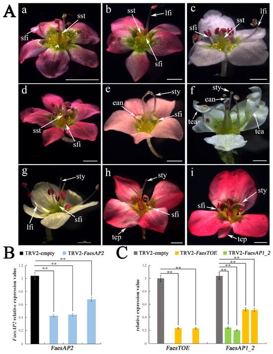 Phenotypes and gene expression of FaesAP2, FaesTOE, and FaesAP1_2-silenced LH F. esculentum flowers. (A): Phenotypes of FaesAP2, FaesTOE, and FaesAP1_2-silenced LH flowers. (Aa) TRV2-FaesAP2-treated red flower with three short styles and eight short stamens; (Ab) TRV2-FaesAP2-treated red flower with three short styles, five short stamens, and three long stamens; (Ac) TRV2-FaesAP2-treated white flower with three short styles, five short stamens, and three long stamens; (Ad) TRV2-FaesTOE-treated red flower with three short styles and eight short stamens; (Ae) TRV2-FaesTOE-treated red flower with three long styles and seven short stamens consisting of short filaments and empty anthers (male sterile anther); (Af) TRV2-FaesTOE-treated white flower with three tepals, two filaments with anthers homeotically converted into tepaloid structure (tepal attachment of male sterile anther) on the top, three filaments with sterile anthers on the top, three long stamens, and three long styles; (Ag) TRV2-FaesAP1_2-treated white flower with three long styles, three long stamens, and five short stamens; (Ah) TRV2-FaesAP1_2-treated red flower with four long styles, six short stamens, and four tepals; (Ai) TRV2-FaesAP1_2-treated red flower with two long styles and six short stamens, four tepals. Style (sty), tepal (tep), long filament (lfi), short filament (sfi), short style (sst), tepal attachment of anther (tea), empty anther (ean); scale bar = 1 mm; double asterisk (**) indicates statistical significance at p-value ≤ 0.01. (B) The expression levels of FaesAP2 in the TRV2-empty-treated and TRV2-FaesAP2-treated LH flowers with strong phenotypic changes; (C) The expression levels of FaesTOE and FaesAP1_2 in the TRV2-empty-treated, TRV2-FaesTOE-treated, and TRV2-FaesAP1_2-treated LH flowers with strong phenotypic changes. The grey column was TRV2-empty-treated LH flowers, the green column was TRV2-FaesAP1_2-treated LH flowers, and the orange column was TRV2-FaesTOE-treated LH flowers.