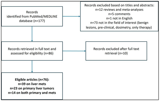 Only articles written in the English language and studies conducted on human subjects, that included patients with neoplastic liver lesions (primary hepatic tumors and/or liver metastases), and with available data on the diagnostic performance of PET imaging with radiolabeled FAPIs (regardless of disease stage and clinical indication for PET examination) were considered. After screening titles and abstracts, an initial selection was performed, excluding (a) articles not within the field of interest of this review (e.g., not evaluating patients with neoplastic liver lesions; with no data on PET imaging; focused on FAPI synthesis, biodistribution, pharmacokinetics, or dosimetry, or only on radiolabeled FAPI therapy); (b) pre-clinical studies; (c) review articles and meta-analyses, editorials, letters, commentaries, and conference proceedings. Then, two researchers (FM and GP) independently reviewed the full-text versions of the selected articles to assess them for final eligibility, and possible disagreements were resolved by consensus. For each included article, information was collected about the basic clinical characteristics (study design, number of patients with neoplastic liver lesions, primary liver tumors, or liver metastases, etc.), and methodological aspects (FAPI tracer, injected activity, scan delay as the interval between injection and PET image acquisition, comparison with PET imaging using other radiopharmaceuticals when available, etc.).
