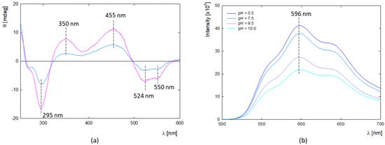 (a) CD spectra of aggregated forms of doxorubicin in water solution and its dependence on concentration (blue line—c = 0.5 mg/mL, pink line—c = 1.0 mg/mL). (b) Fluorescence spectra of doxorubicin and its dependence on pH (c = 2 μg/mL, H2O).