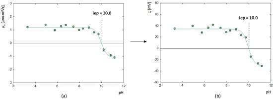 The measurement of the electrophoretic mobility of doxorubicin molecules made it possible to determine their zeta potential, as illustrated in Figure 2. The analysis showed that the isoelectric point (iep) at which the molecules have a neutral charge (ζ = 0 mV) occurs at pH = 10.0. Below this value, the zeta potential of doxorubicin molecules is positive, which averages ζ = 35.8 ± 3.8 mV, while above this, at strongly alkaline pH, doxorubicin molecules become negatively charged. This correlates well with the results of Ryzkhina et al., who also observed a cationic form with a charge of ζ = 17.0 mV for an aqueous solution of DOX [34].