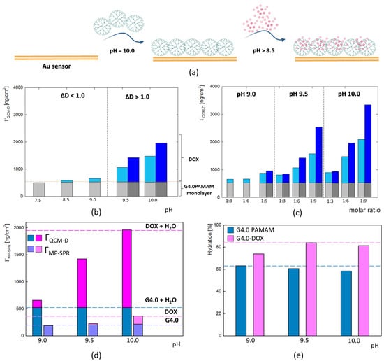 (a) Schematic representation of the G4.0-DOX bilayer formation on the Au surface (created with BioRender.com). (b) The mass of the adsorbed G4.0 PAMAM/DOX bilayers (ΓQCM-D) on the gold surface and its dependence on DOX pH, monitored by QCM-D (G4.0/DOX molar ratio 1:6, cG4.0 = 17.6 μM, pHG4.0 = 10.0, water). The gray color corresponds to the G4.0PAMAM monolayer, and the blue color corresponds to the DOX layer. The Sauerbrey model was used in the pH = 7.5–8.5 (light gray and light blue bars), and the Voigt model for pH = 9.0–10.0 (dark gray and dark blue bars). (c) The mass of the adsorbed G4.0 PAMAM/DOX bilayers on the gold surface and its dependence on DOX pH and concentration, monitored by QCM-D (cG4.0 = 17.6 μM, pHG4.0 = 10.0, water); with the exception of G4.0-DOX 1:3 pH = 9.0, the Sauerbrey and Voigt model was applied and compared to all the layers. (d) A comparison of the adsorbed masses by the QCM-D and MP-SPR methods. (e) The percentage of water in the QCM-D layers for the G4.0 PAMAM and DOX layers for the various pH conditions of the DOX solution (cG4.0 = 0.25 mg/mL, pHG4.0 = 10.0, cDOX = 0.06 mg/mL, H2O).