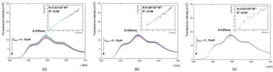 The fluorescence spectrum of DOX shows three distinct peaks at around λmax1 = 550, λmax2 = 596, and λmax3 = 640 nm (Figure 1b). The vibrational structures observed in the absorption and fluorescence spectra are due to symmetric modes associated with the dihydroxyanthraquinone molecule’s C=O bending, backbone stretching, and -OH bending motions [32]. The spectra’s shape and maximum position confirm the presence of the monomeric form of DOX at low concentrations. The trend of fluorescence intensity changes with pH shows that the protonated form of DOX exhibits the highest fluorescence, while above pH 7.5, it is successively quenched.