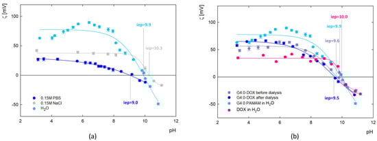 The values of zeta potential as a function of pH for the dendrimer and the G4.0 PAMAM-DOX complex were calculated from electrophoretic mobility (μe) measurements and presented in Figure 5. The results show changes in the zeta potential of G4.0 PAMAM as a function of pH, ionic strength, and solvent (Figure 5a). The presence of amine functional groups on the surface of the dendrimer determines the charge changes. In the aqueous solution, G4.0 PAMAM has a high zeta potential (69.7 mV for pH = 7.5), which successively decreases with increasing pH and reaches the isoelectric point (iep) at pH = 9.9. Increasing the ionic strength causes the zeta potential to drop to 37.7 mV for 0.15 M NaCl and 13.9 mV for 0.15M PBS (pH = 7.5), consistent with the other literature data [48]. Depending on the solvent, the isoelectric point is shifted to pHiep = 10.3 and pHiep = 9.0 for NaCl and PBS, respectively.