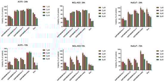 The cytotoxic effect of G4.0 PAMAM nanocarriers against human cancer (A375, NCL-H23) and immortalized cells (HaCaT) as a model of the normal cell line, evaluated by the MTT assay after 24 and 72 h.