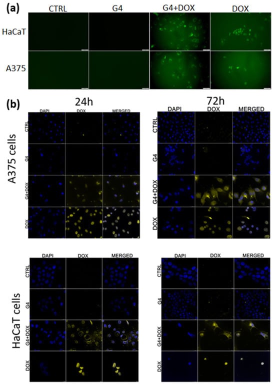 Internalization of G4.0 PAMAM-DOX and free DOX by confocal microscopy in A375 and HaCaT cells: intravital analysis after 24 h (a) and analysis of fixed cells after 24 and 72 h (b). DOX- green color; nuclei- DAPI blue color.
