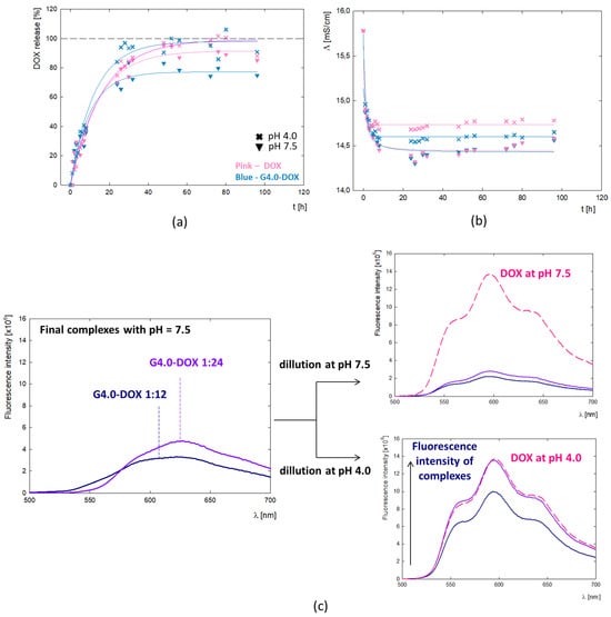 (a) Release profile of doxorubicin from the complex compared to the DOX of the same concentration (c = 38 μM) into the PBS buffer at pH 7.4. Triangle—final complex at pH 7.5; cross—final complex after reducing to pH = 4.0. (b) Change in the electrolytic conductivity of the PBS buffer during the release assay. (c) The fluorescence spectra of the G4.0-DOX complexes at the molar ratios of 1:12 and 1:24, their changes after dilution in water at pH 7.5 and pH 4.0 and comparison with the reference DOX solution at the same pH and concentration (c = 5 μM).