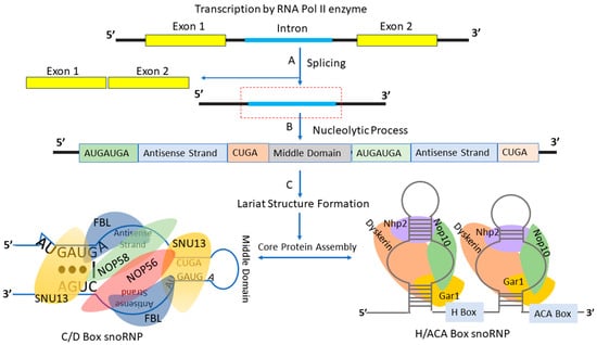 Diagrammatic representation of snoRNA biogenesis. (A) After the transcription process, newly formed mRNA undergoes a splicing process to remove the introns. (B,C) These introns undergo further nucleolytic processing, then lariat structure formation evolves as either C/D box snoRNAs or H/ACA snoRNAs. (C) The snoRNAs specifically bind to the SNU13 (aka 15.5K), NOP56, NOP58 and FBL proteins to become C/D box snoRNPs, while the assembly of H/ACA snoRNPs involves core proteins such as Nap57, Cbf5p (dyskerin), and GAR1.