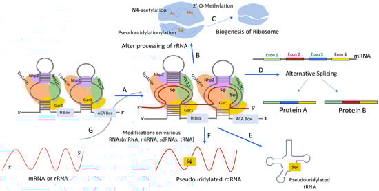 Depicting H/ACA snoRNP modifying various RNAs. (A,G) The H/ACA box snoRNP formed after the snoRNA is associated with multiple proteins (e.g., Nhp2, Nop10, Dyskerin and Gar1), are actively involved in the modification of various RNAs (miRNA, tRNA, mRNA, rRNA or/and sdRNA). (B,C) These H/ACA box snoRNAs are also involved in modifications (N4-acetylation, 2′-O-methylation and Pseudouridylation) on rRNA, and then help in the biogenesis of ribosomes. (D) Alternative splicing of mRNA is one of the important functions of these snoRNAs as well. (E,F) These H/ACA box snoRNAs are in addition actively involved in the pseudouridylation of mRNAs and tRNAs and help in their maturation.