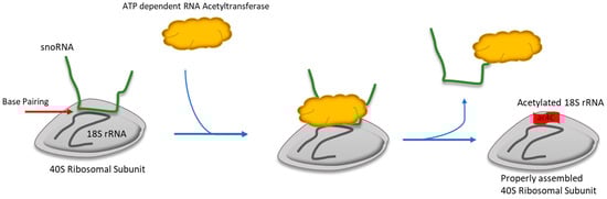 Acetylation of 18S ribosomal RNA. Acetylation is one of the other important modifications required for the proper assembly of the ribosome or ribosomal biogenesis. In this figure, it is evident that snoRNA makes the Watson–Crick base pairing with 18S rRNA but prior to the interaction with RNA acetyltransferase. RNA acetyltansferase helps then the 18S rRNA to be navigated, prior to acetylate cytidine residues.